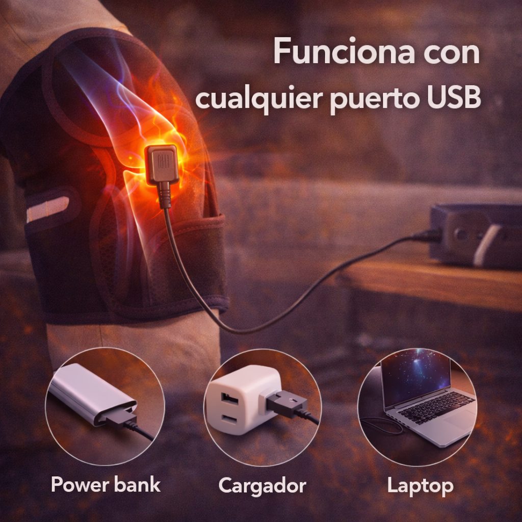 No. La rodillera no usa baterías internas, lo que la hace más ligera, segura y práctica. Solo necesita una fuente USB.