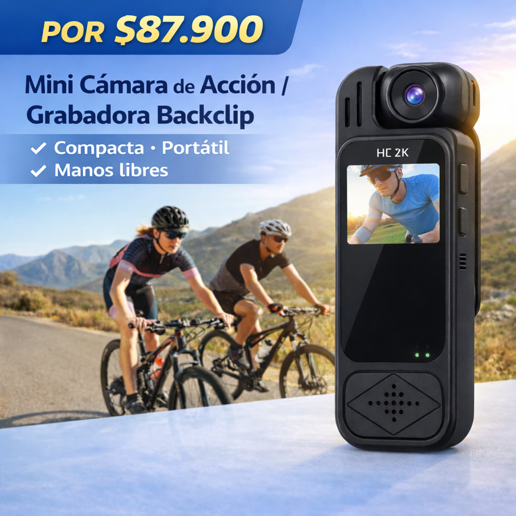 Una mini cámara de acción con clip trasero, diseñada para fijarse a tu ropa o mochila y grabar por ti, sin complicaciones.
