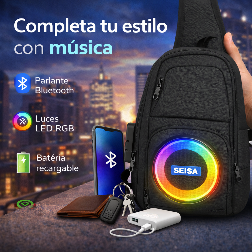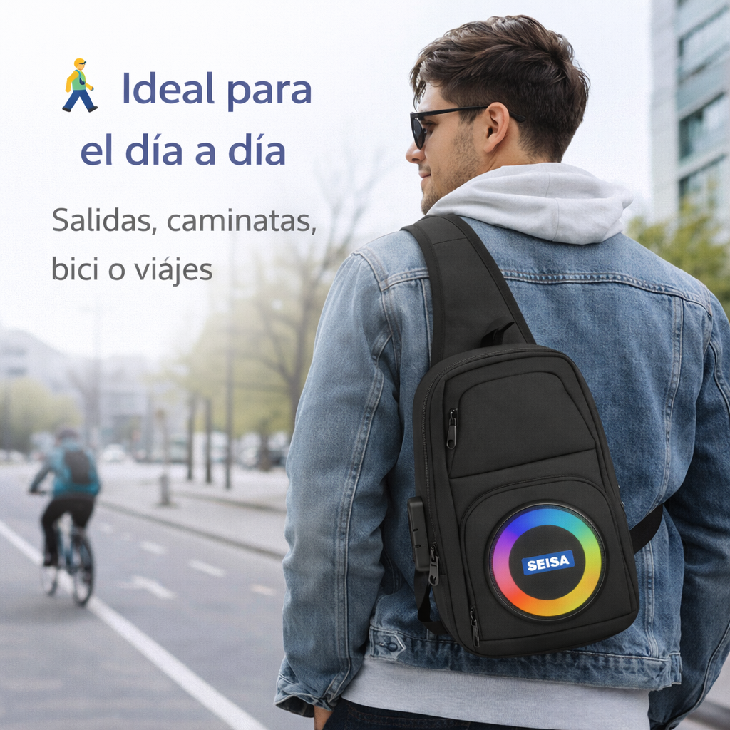 El bolso urbano con parlante Bluetooth y luces LED RGB que combina estilo, tecnología y comodidad en un solo accesorio.
