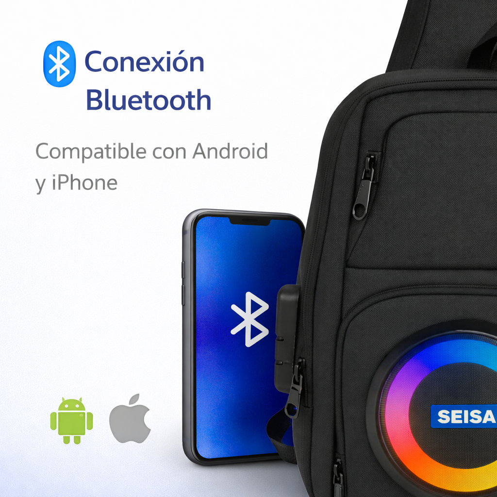 El bolso cuenta con un parlante Bluetooth integrado que se conecta de forma inalámbrica a tu celular. Solo debes activar el Bluetooth, buscar el dispositivo y comenzar a reproducir tu música.