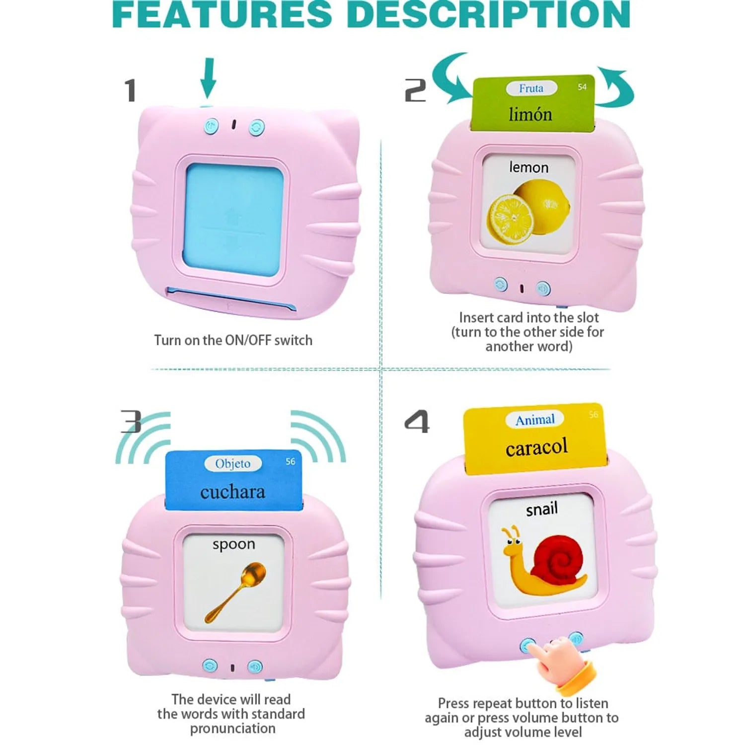 ✅ Súper fácil. Solo debe insertar una tarjeta y el lector pronuncia la palabra automáticamente.