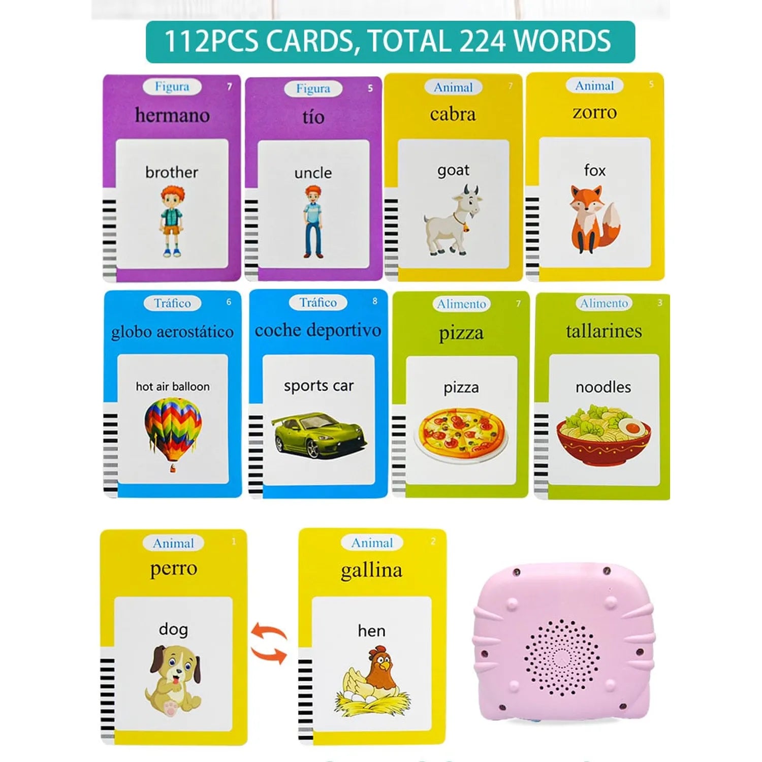 Las tarjetas ilustradas facilitan la asociación visual y auditiva. Tu hijo escucha la pronunciación clara en ambos idiomas y aprende repitiendo de manera natural.